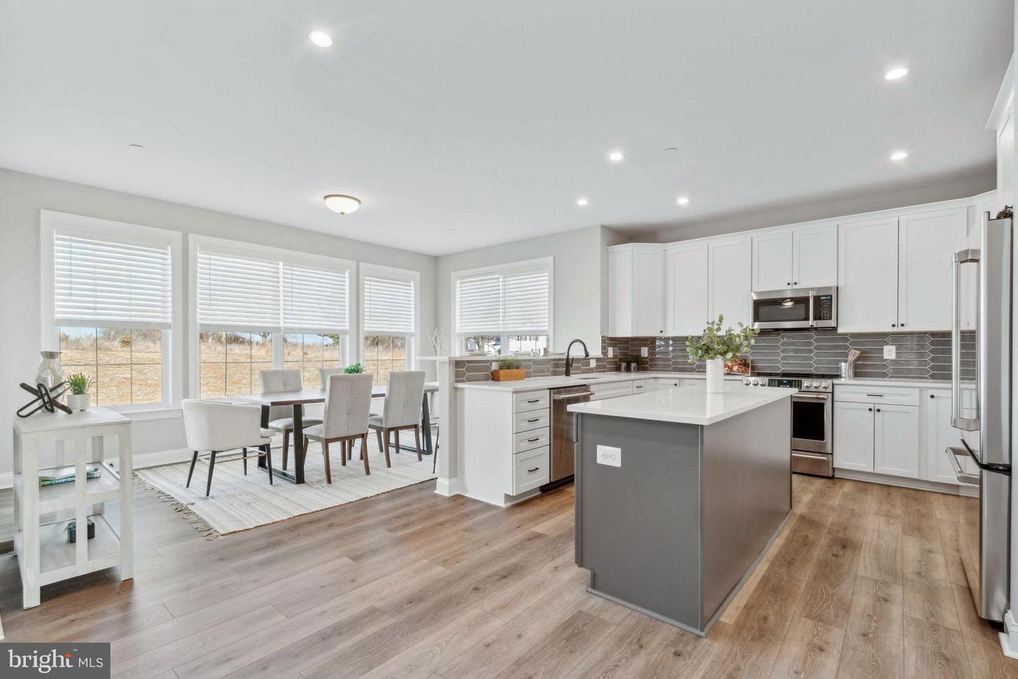 The separate dining room is conveniently positioned off the GOURMET kitchen with the OVERSIZED island, an abundance of cabinets and food prep space, QUARTZ Counters, Ceramic Tile Backsplash, Stainless Steel Appliances, WALK-IN Pantry, and eat-in morning/sun room with French door access to your rear yard.